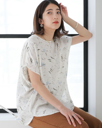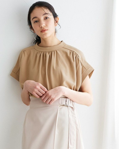 袖丈を長めに設計し、半袖に近い感覚で着用できるブラウス。フレンチスリーブ特有の袖に切り替えのないデザインで、肩から腕にかけて女性らしいカーヴィーなラインを描いています。このアイテムのもう一つの特徴は、体の前後をぐるっと覆うアシンメトリーなギャザーデザイン。ふんわりとしたシルエットでお腹まわりも気になりません。