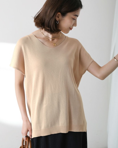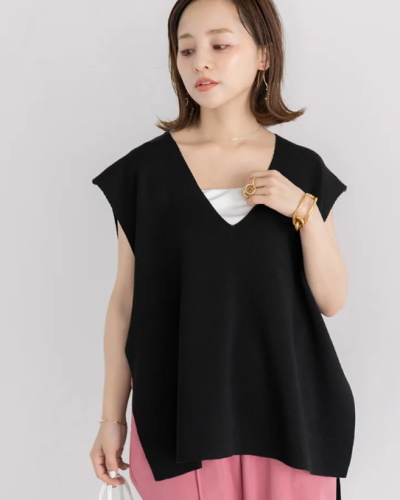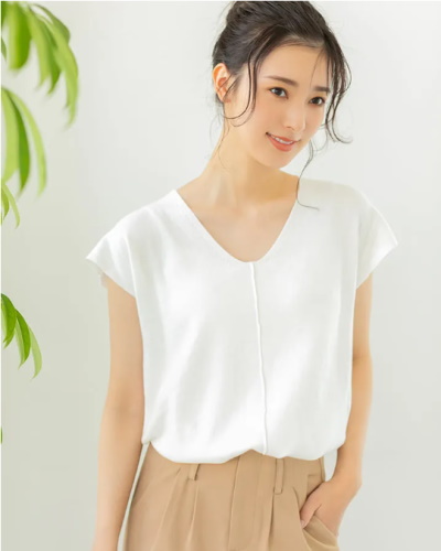袖口が広く開いたフレンチスリーブニットで、腕まわりに余裕のある細見えコーディネートに。深めのVネックということもあり、ベストを着る感覚でレイヤードスタイルに仕上げるのがおすすめ。暗めの色を選んでも、インナーに白のキャミソールをのぞかせると夏らしく見えます。ボトムスには旬のカラーパンツを合わせて今っぽい印象に。