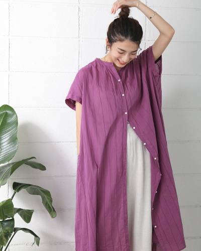 骨格がしっかりしているからこそ着こなせるのが、全体的に余裕のあるワンピースです。肩や鎖骨にフレーム感があることで、ゆったりとしていても太って見えず、スタイリッシュな雰囲気で着こなすことができます。フレンチスリーブで二の腕をうまく隠しながら、フロントのボタンを外して解放感いっぱいにアレンジ。レイヤードスタイルですが、風が通り抜けるので涼しく感じられます。