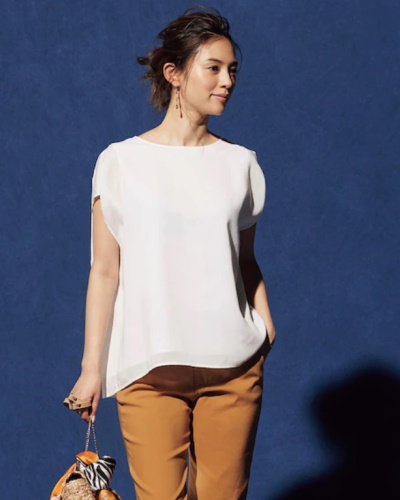 二の腕の太さやたるみが気になる場合は、袖丈の長いフレンチスリーブアイテムを選ぶのがおすすめです。二の腕をほぼ丸ごとカバーしながら、フレンチスリーブ特有の斜めにカットされた袖口で、より軽やかにこなれて見えます。ノーマルな半袖に近い感覚で着用できるので、フレンチスリーブを着慣れていない人でも着こなしやすいでしょう。