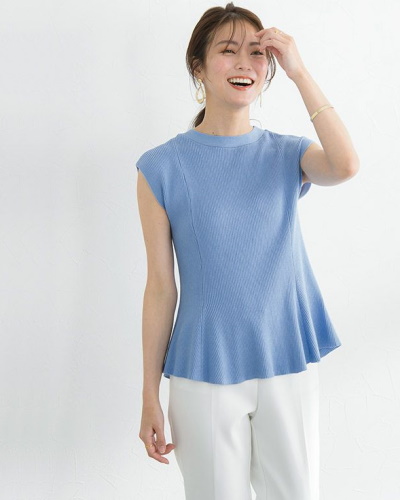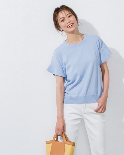 ニット素材のフレンチスリーブアイテムは腕まわりが詰まったデザインが多く、脇やインナーのチラ見えが気になりにくいのがポイント。袖が短くても肩のラインはきちんと隠せるところがフレンチスリーブならではの魅力です。ストレッチの効いたリブニットは、ボディラインを程よく拾ってフェミニンな雰囲気で着こなせます。