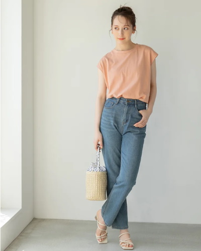 袖の短いフレンチスリーブカットソーで、暑い日も快適なコーディネートに。気になる肩の上部を効果的に隠しながら、短い袖で涼しさをキープできます。デザインがベーシックなので、定番のモノトーンとトレンドカラーなど色違いで手に入れておいてもいいですね。画像ではシャーベットのようなオレンジを合わせて、いつものデニムスタイルを旬の装いに仕上げています。