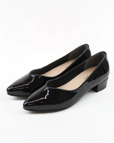 梅雨仕様のおしゃれなポインテッドパンプス。アッパーは水を弾くエナメル素材。