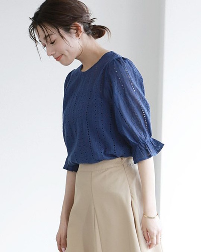 こちらのブラウスはパフスリーブと袖先のフレアが女性らしい雰囲気で、大人フェミニンなコーディネートにおすすめです。