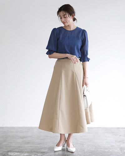 オンシーン②5分袖ブラウス×撥水フレアスカートのコーディネート